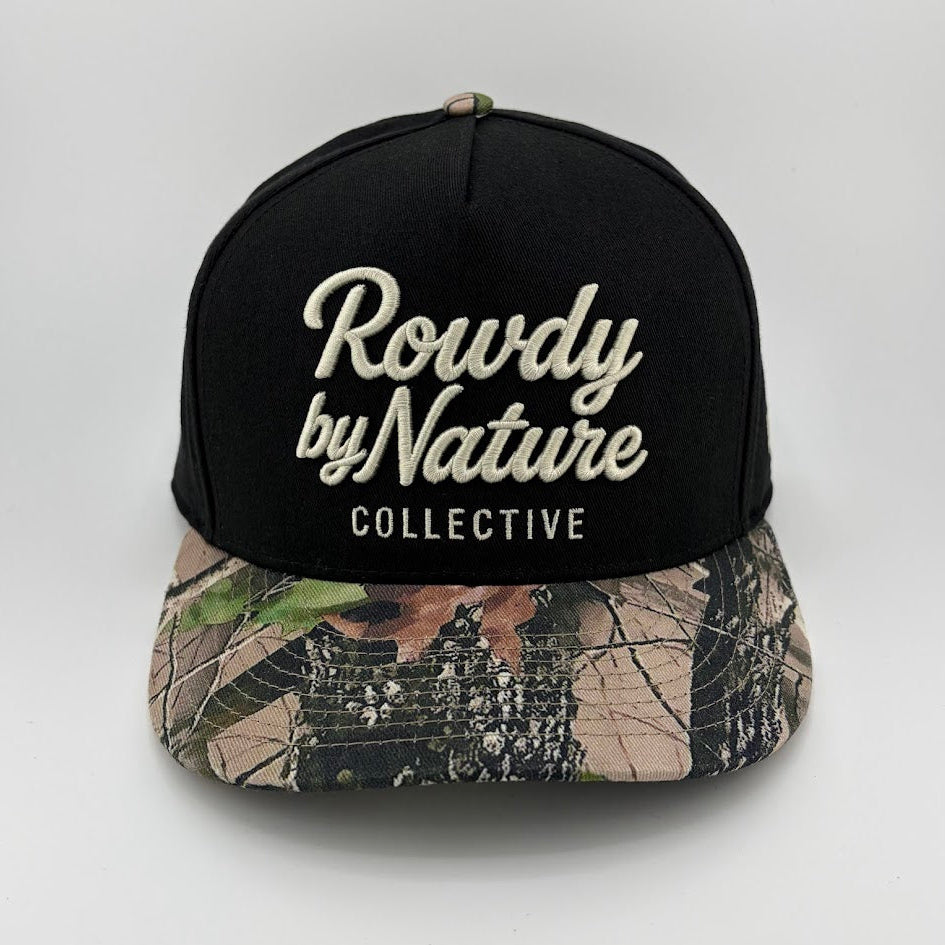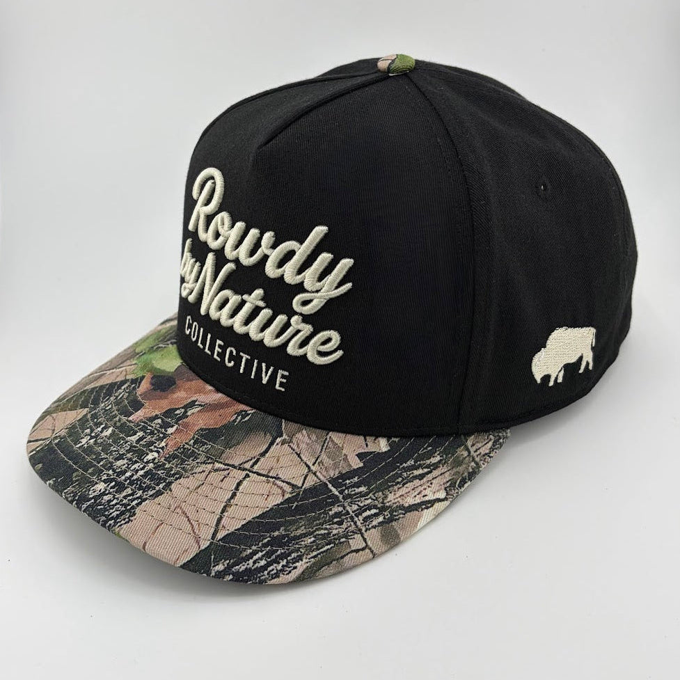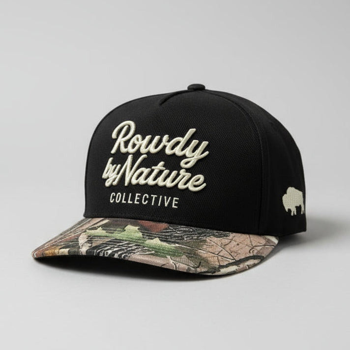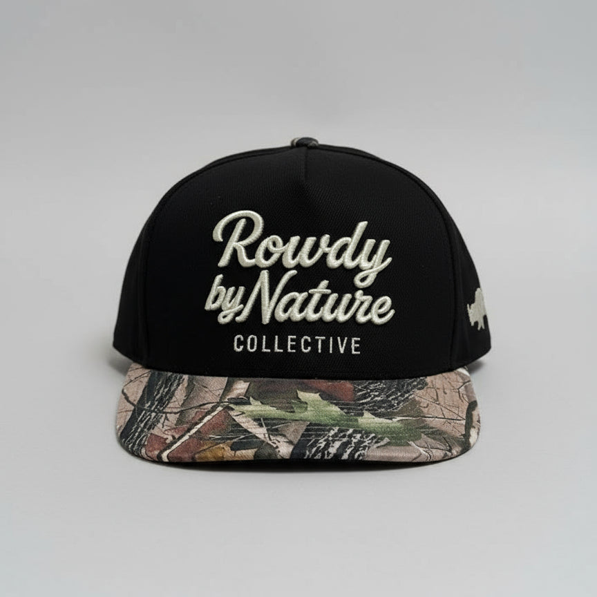 The Midnight Hunter Snapback from Rowdy by Nature Collective is built for those who move with quiet confidence. Featuring a high-crown design with bold raised embroidery, it delivers a clean, commanding look that stands out from dawn to dusk. The black front panel and camo-patterned bill strike the perfect balance between rugged and refined, while the buffalo emblem on the side reminds you to stay wild — no matter where the trail leads.